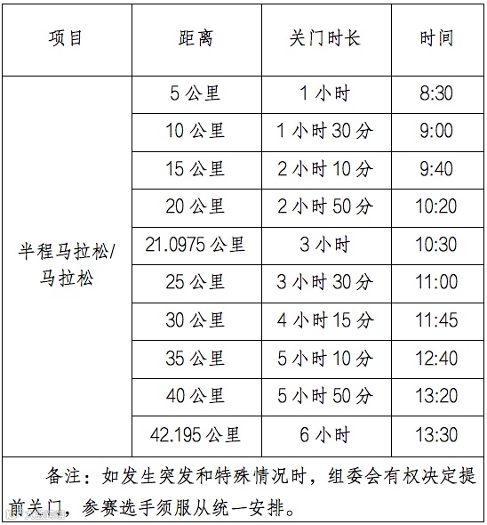为了保证参赛选手比赛安全、顺利,比赛期间比赛路线各段实行限时交通封闭,关门时间到后,相应路段将逐段恢复开放社会交通。参赛选手在规定的关门时间内,未跑完对应的距离者须立即停止比赛,退出赛道,以免发生危险。退出比赛的选手可乘坐组委会提供的援助车到终点处。