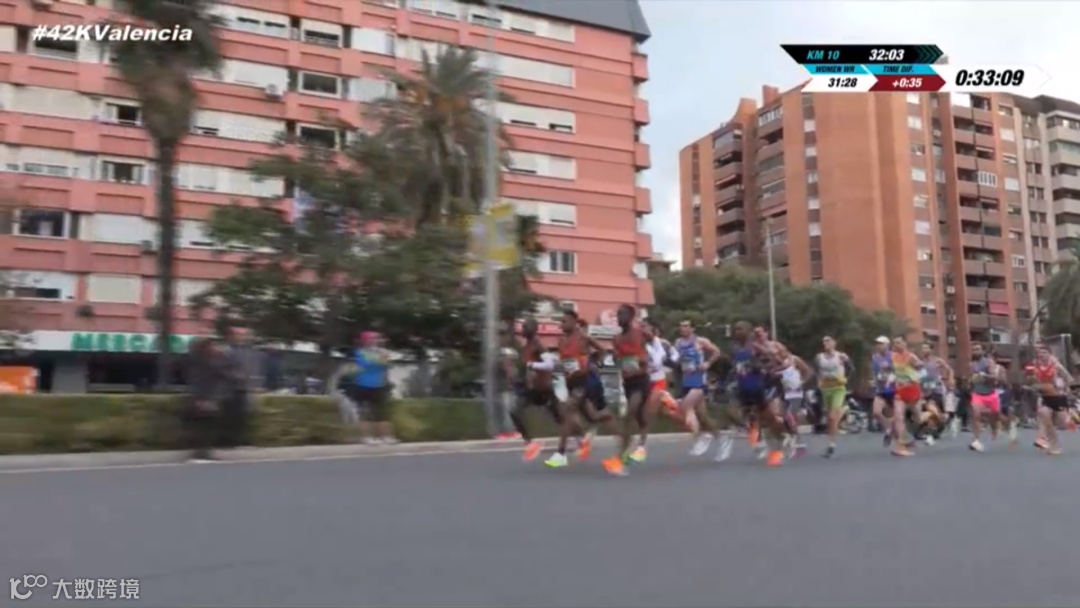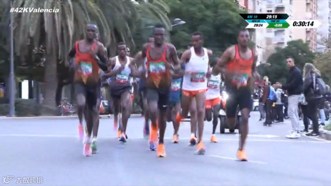 今年的瓦伦西亚马拉松选用分枪出发,精英选手先行出发,10分钟后大众精英选手随后开始出发。男子选手10公里处用时29:15,女子通过10公里处用时32:03。