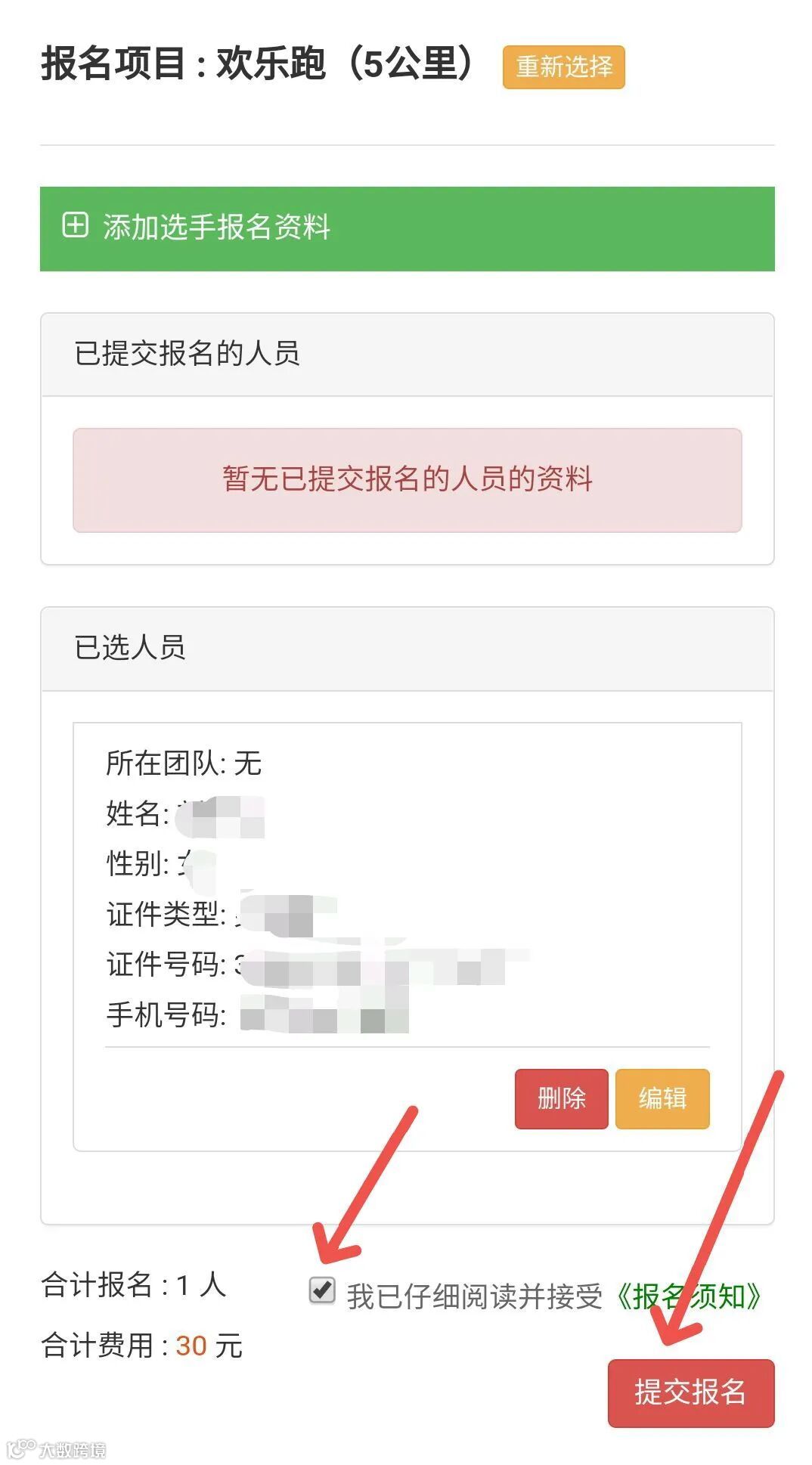 勾选我已仔细阅读并接受《报名须知》,再点击提交报名