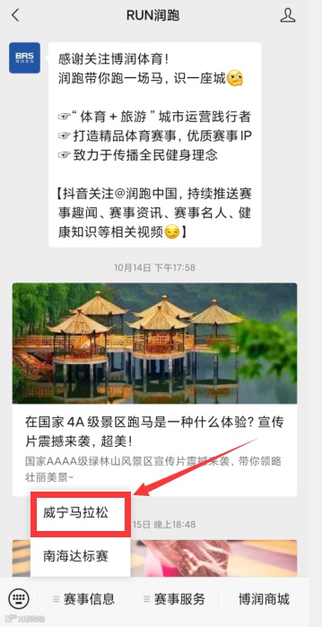 1、关注“RUN跑”官方公众号,点击赛事信息,选择“威宁马拉松”选项,即可进入报名界面。