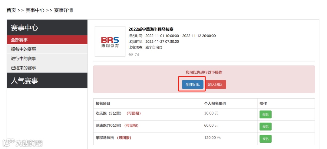 步骤一:进入对应赛事报名页面,选择需要团报的项目,如马拉松项目,点击报名