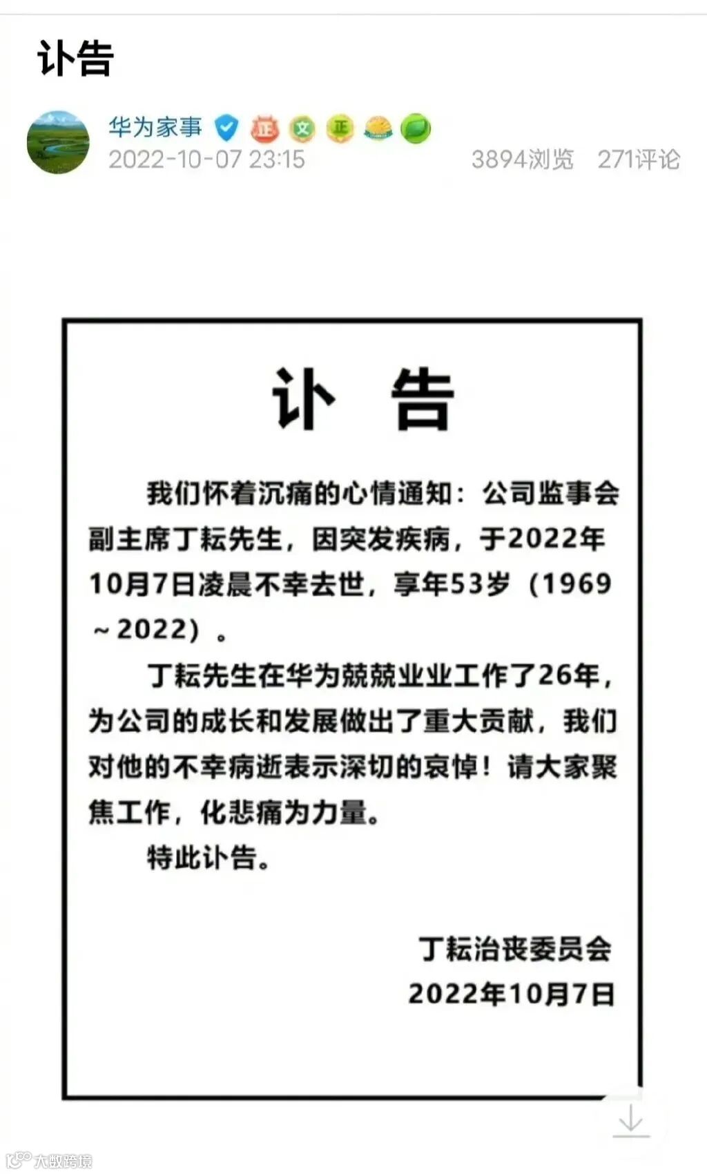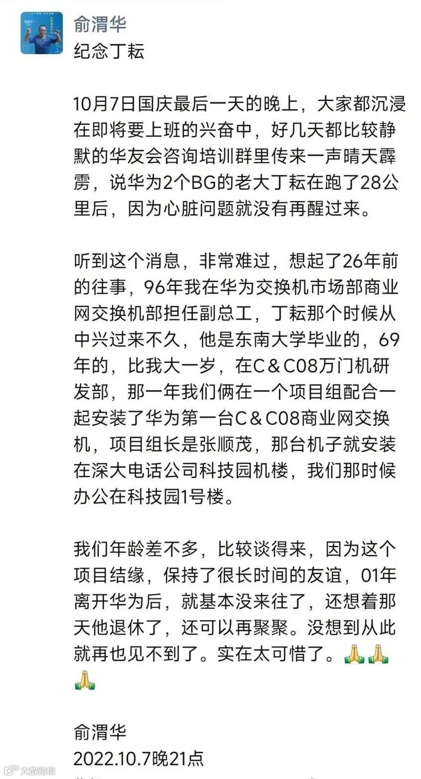 10月7日晚间,华为发讣告表示,“我们怀着沉痛的心情通知,丁耘因突发疾病,于2022年10月7日凌晨不幸去世,享年53岁(1969 ~2022)。”