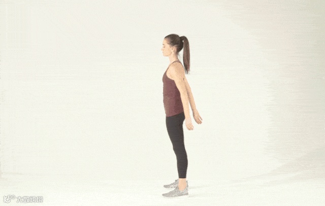 站立,双脚距离两倍肩宽,身体挺直,两眼平视前方