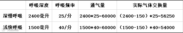 气体进出肺部会经过呼吸道,所以你吸入的每一口气并不会都进入肺部。当呼吸频率过快时,呼吸道内占用的气体容积就会变大,而气体就会在呼吸道来回徘徊,真正进入肺部的气体量将会下降。以呼吸道占用的气体容积为150毫升为例,