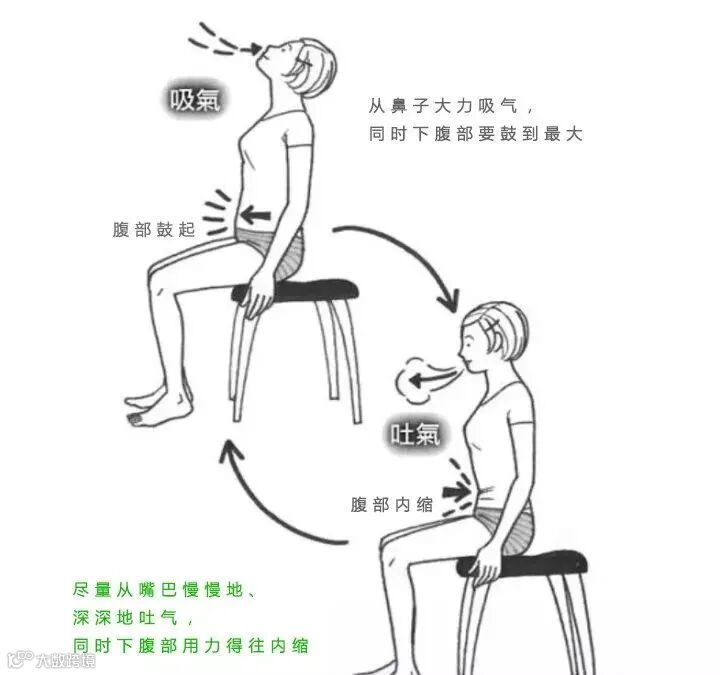 通过腹式呼吸的方法吸气时,腹部会鼓起,而非胸部鼓起,呼气时,腹部会下陷。
