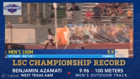 5月6日,NACC D2联盟LSC分区室外锦标赛,来自西德州农工的阿扎马蒂在100米预赛就跑出9秒96,这个成绩打破了自己去年创造的10.03的赛会纪录。
