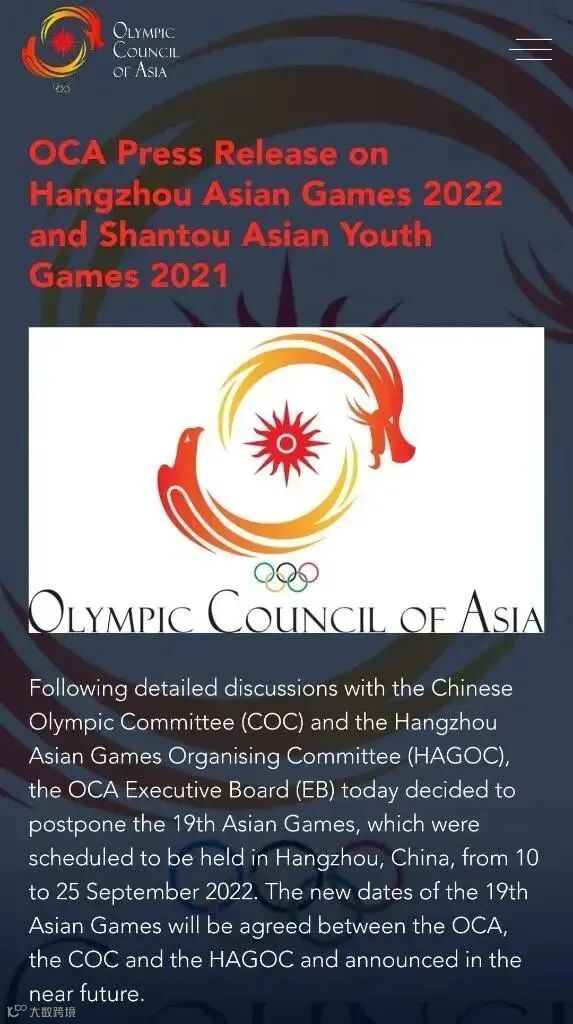 亚洲奥林匹克理事会6日宣布,其执委会在与中国奥委会、杭州亚组委进行充分讨论后决定,原定于2022年9月10日至25日在中国杭州举办的第19届亚洲运动会将延期举行。新的举办日期将在三方协商之后决定。