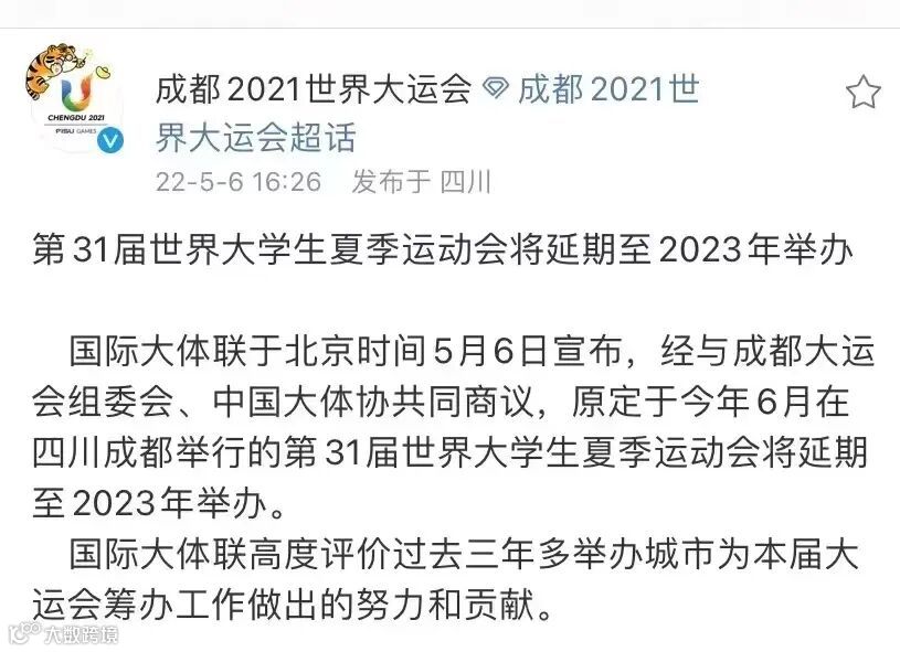 据国际大体联官网消息,原定于2022年6月27日至7月7日举行的成都大运会,将延期至2023年举行。
