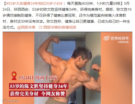 5月24日,陕西西安,53岁的陈文胜坚持健身34年,身材保持如同20岁小伙,令人惊叹!90年代初,他还参加过全国健美比赛,不仅获得了健美比赛冠军,还作为模范案例被编入体育教材。