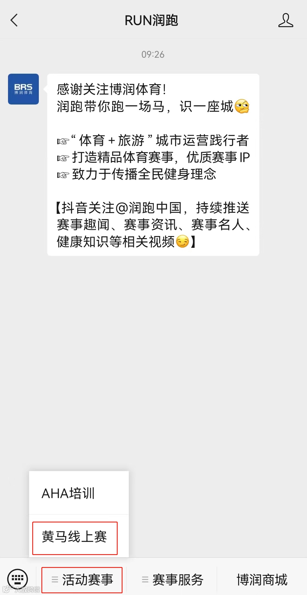 2.进入公众号对话框,点击下方菜单栏“活动赛事”,找到“黄马线上赛”。