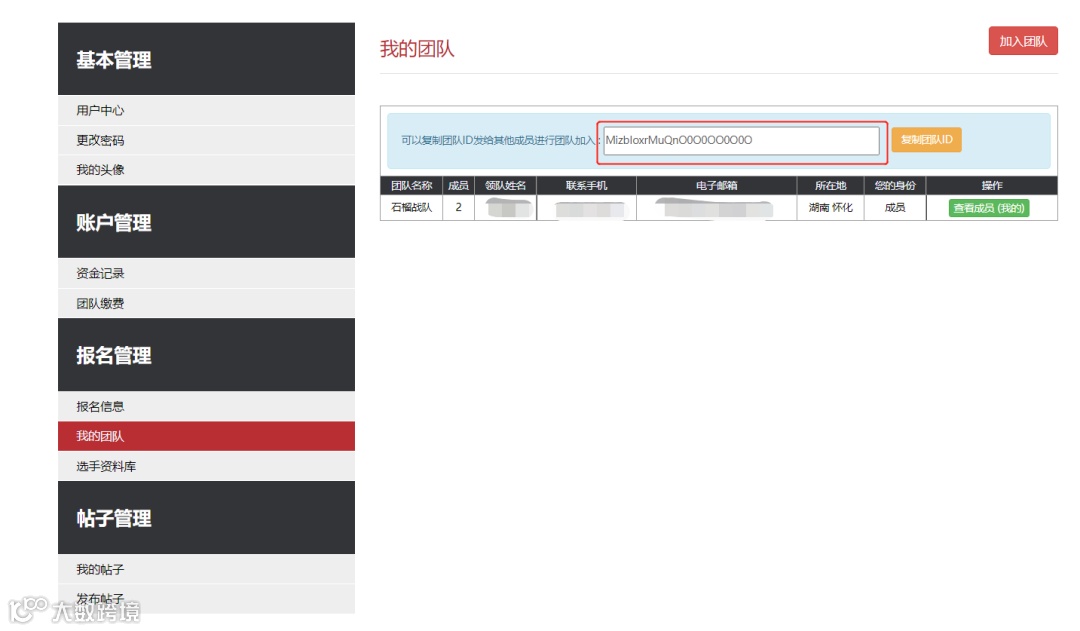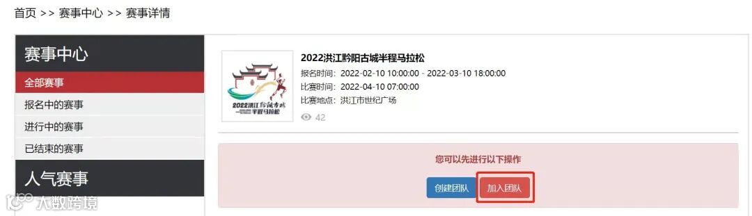 1.没有加入团队的选手,找领队拿到团队ID后登陆个人账号进入团报页面,点击加入团队,进行赛事报名;