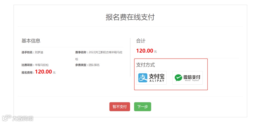 8.进入支付页面,选择支付方式,点击下一步,支付报名费。