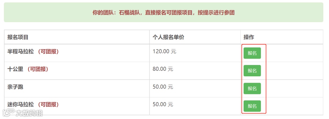 1.进入对应赛事报名页面,选择需要团报的项目,如半程马拉松项目,点击报名;