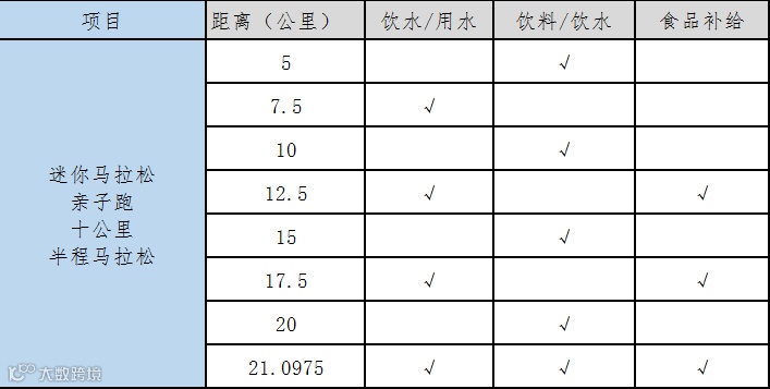 自起点开始每5公里设置一个饮料站,两个饮料站中间设置一个饮水/用水站。
