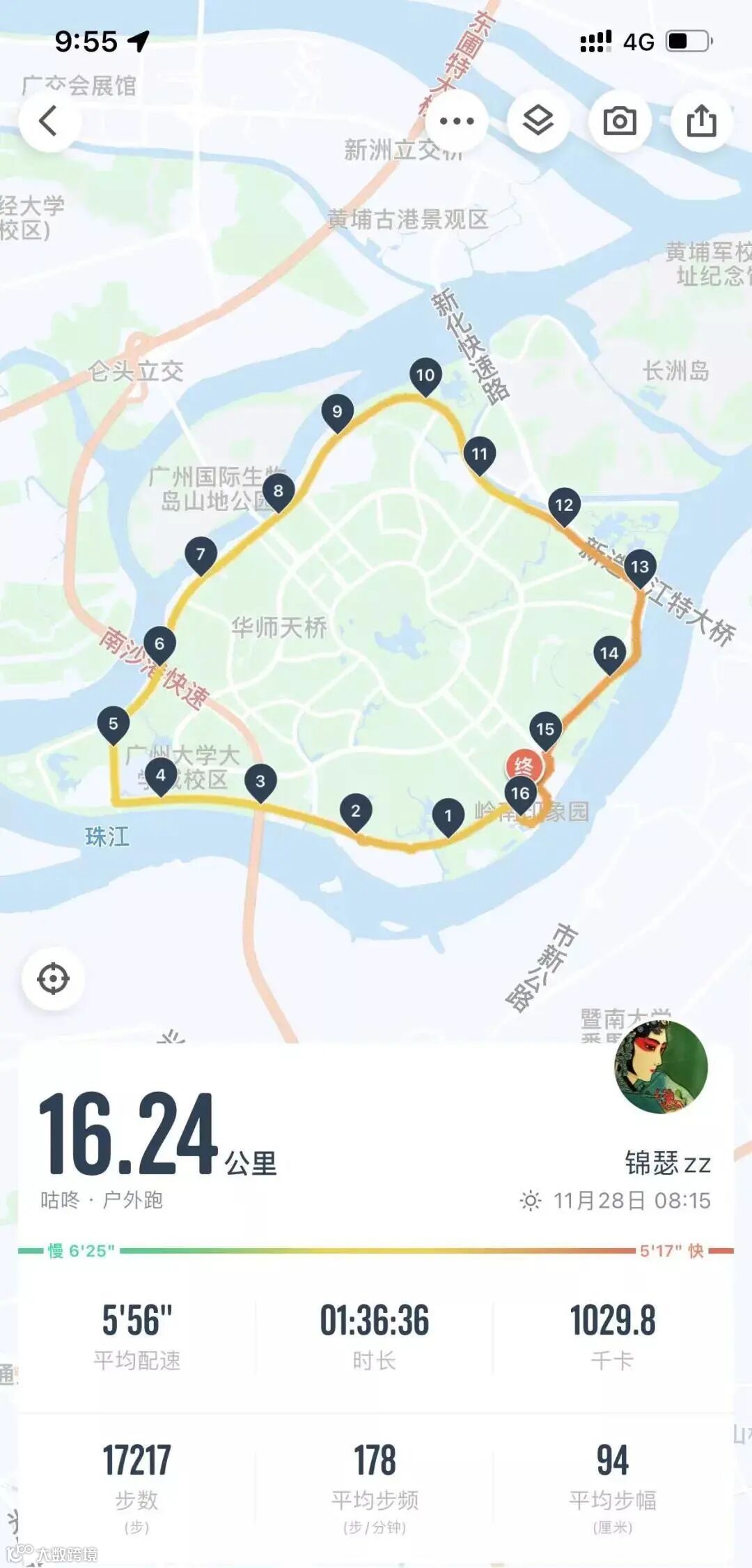 1小时36分,16.24公里,平均配速5′56,如果是在正式赛上,半马我应该能够破2。此刻多么希望有一场比赛来验证我这一年来风霜雪雨、艳阳酷暑的坚持与不弃。