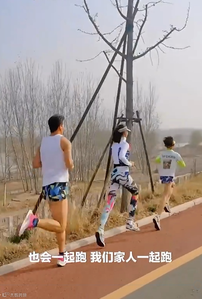 一家三口穿着亲子运动服,儿子跑在前面,妈妈在中间,爸爸跟在最后。大长腿迈开,一家人整整齐齐地跑成一条直线,姿势标准又帅气,组成了这条路上最美的风景。