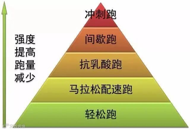想要更高效的进行马拉松备战,除了积累必要的跑量,金字塔训练是最佳模式,所谓金字塔训练就是要把不同配速的训练有机组合,轻松跑位于塔基,表明其是训练的主体,但是不能只有轻松跑,再往上是马拉松配速跑、抗乳酸跑、间歇跑和冲刺跑。