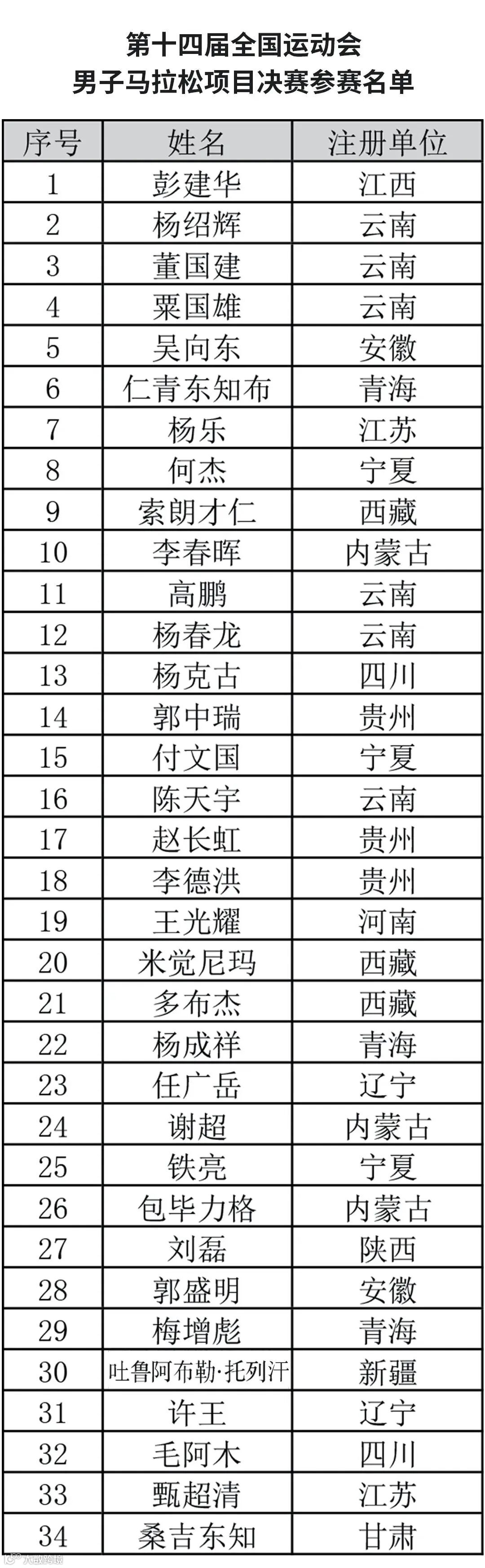 上届全运会男子10000米前8名中,有5人继续出现在今年男子10000米名单中,他们分别是卫冕冠军多布杰、亚军董国建、第五名朱仁学、第七名旦木真次旺、第八名赵长虹。同时,江西名将彭建华、辽宁名将任广岳、四川名将杨克古的加入,也让本届男子10000米比赛的形势变得扑朔迷离。