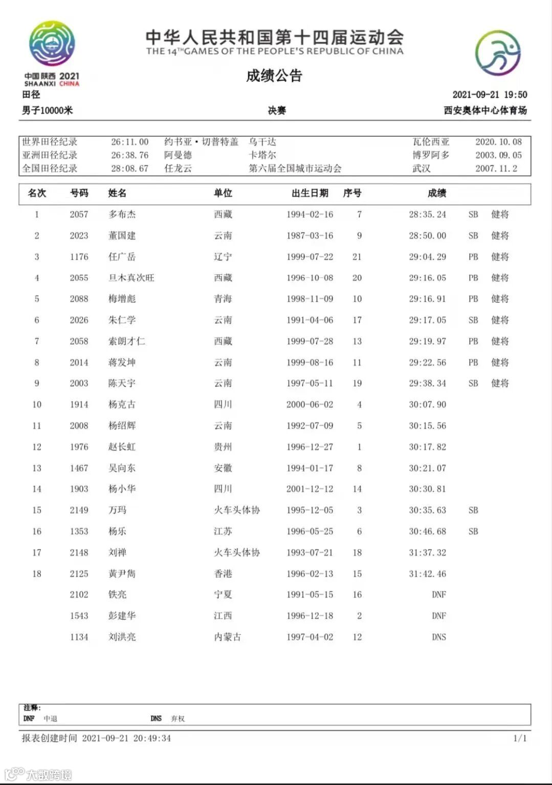 最终,经过激烈的角逐,西藏选手多布杰以28分35秒24的成绩,夺得2021年第十四届全运会男子10000米冠军,该成绩也刷新了2021赛季男子10000米最好成绩。多布杰也成为了继云南传奇运动员张国伟之后,第二位在全运会男子10000米赛场上卫冕成功的选手。