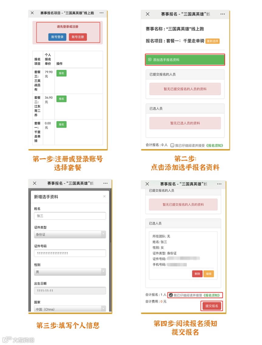 个人/团队形式报名参与活动,选择“魏蜀吴”中的任意一个阵营,在规定活动时间内,完成指定里程(单次跑量不少于3KM),通过任意第三方运动APP(咕咚、KEEP、悦跑圈、咪咕善跑等)进行记录,在指定通道上传轨迹截图,经组委会工作人员审查无误,即为完赛。完赛选手可获得电子纪念证书及相应抽奖机会。