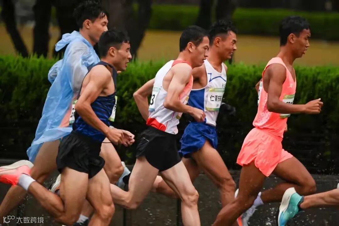 8点整,男子选手组29名选手开始起跑。第一公里用时3分10左右,选手相互交替领跑。随着雨势加大,赛道上有很多积水,有选手为了躲避水坑,甚至会跑到赛道边缘。5公里,男子领先选手用时15分50秒左右,平均配速3分9秒,选手配速比较接近,杨绍辉处于领跑位置。