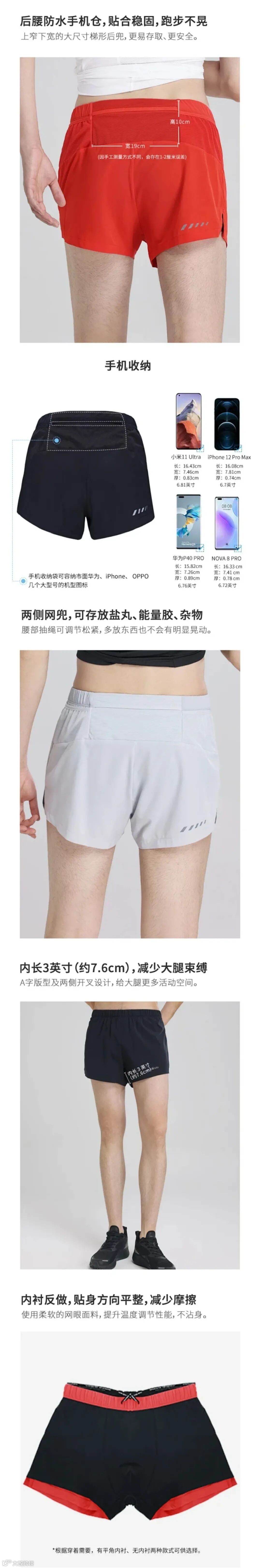 吸湿速干、运动自如,后腰防水手机仓,贴合稳固,上宰下宽的大尺寸梯形后兜,更安全!