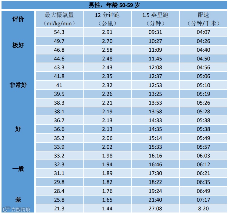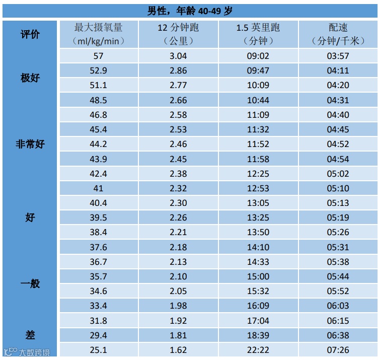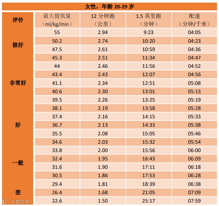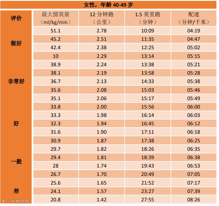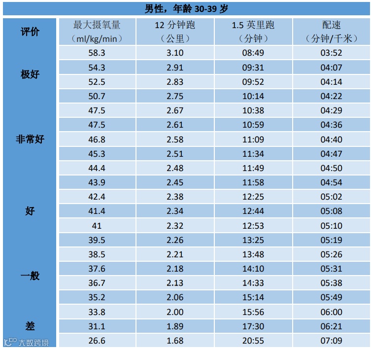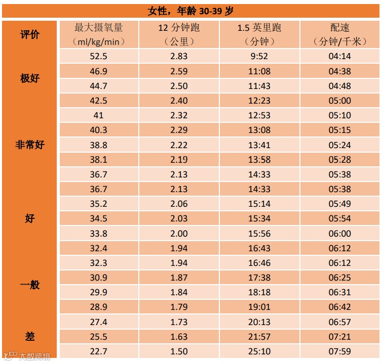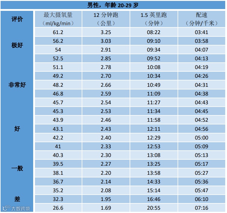 测试指标:12分钟竭尽全力的跑步距离(需要在记录时间的同时能记录下跑距)。