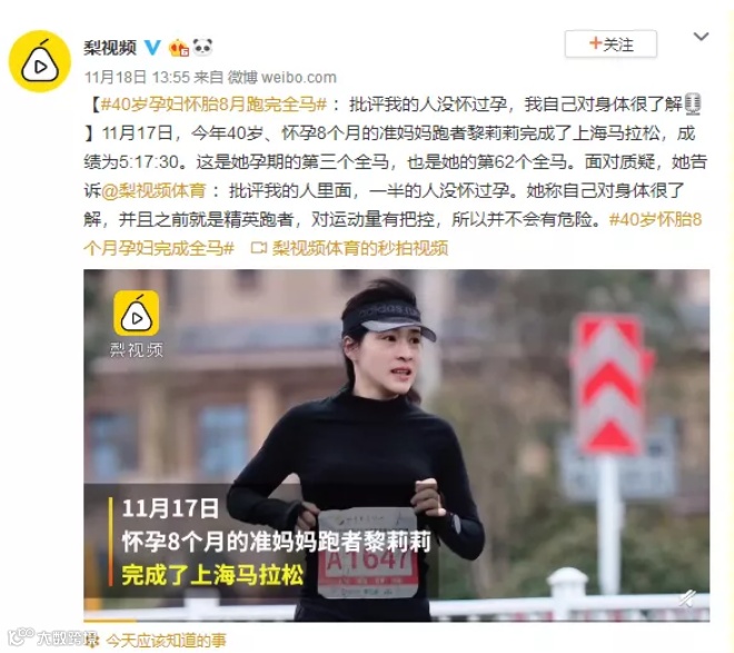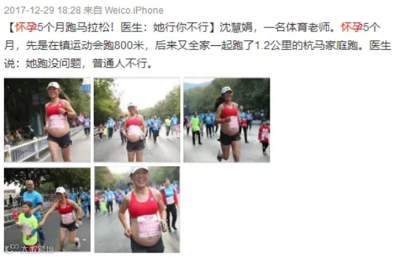 先是在怀孕5个月时,半小时内跑完了超过5公里的马拉松。