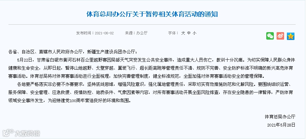 6月2日,国家体育总局办公厅发布关于暂停相关体育活动的通知。通知全文如下: