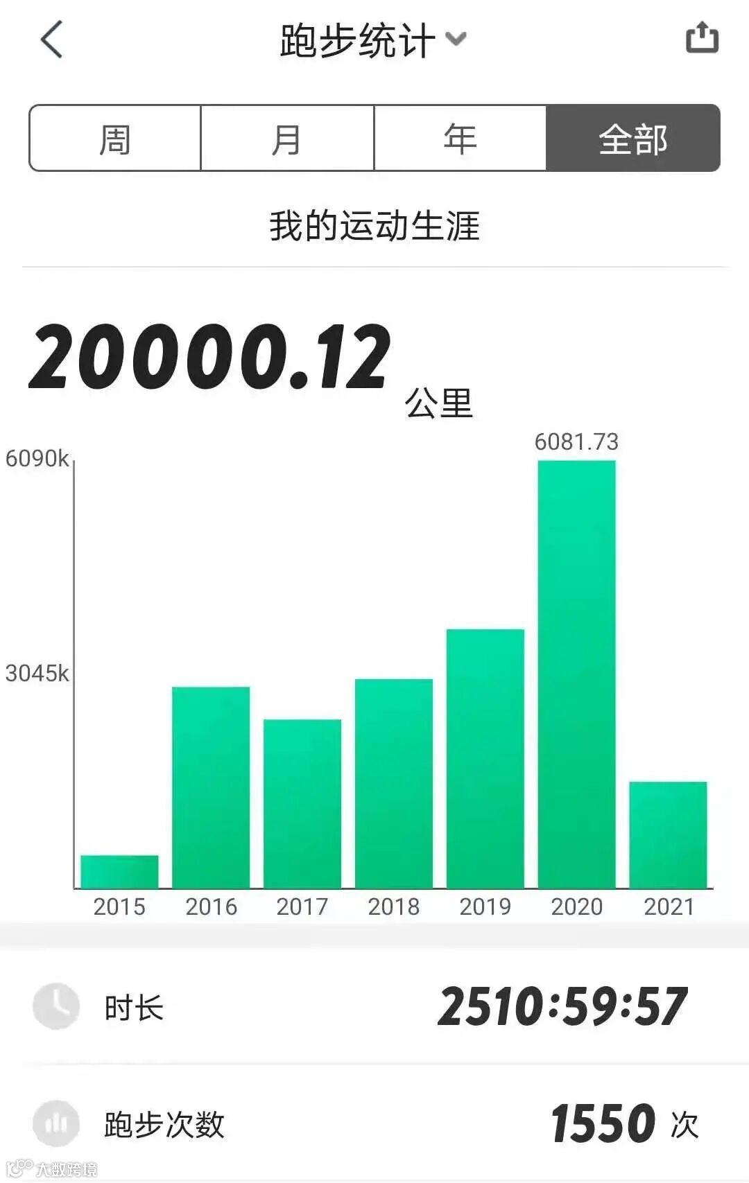 自此以后,信老开始对跑步逐渐入迷,每天给自己定的跑步的标准是10公里,但不是每天只跑10公里,从2016年至今五年多,信老在咕咚记录的跑步次数是1550次,累计时间为2510小时,累计里程为两万多公里。“每天跑完步,都觉得身体轻松,心情舒畅,要是不跑,总觉得哪里少点什么。”