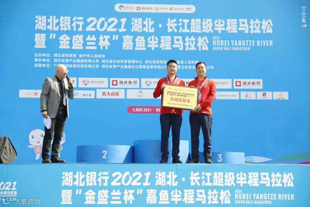 嘉鱼县县委副书记、县政府县长为长江超马嘉鱼站总冠名湖北金盛兰冶金科技有限公司代表授牌