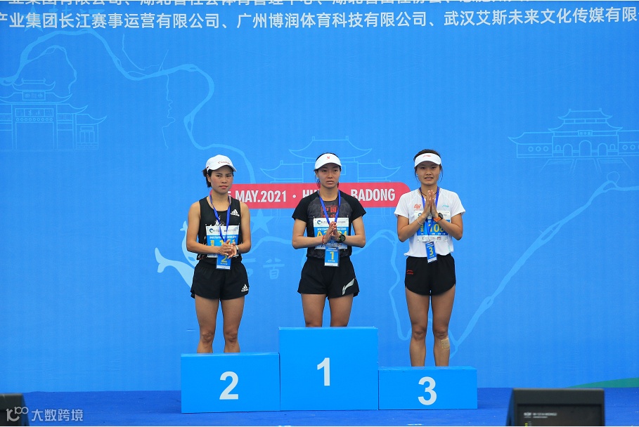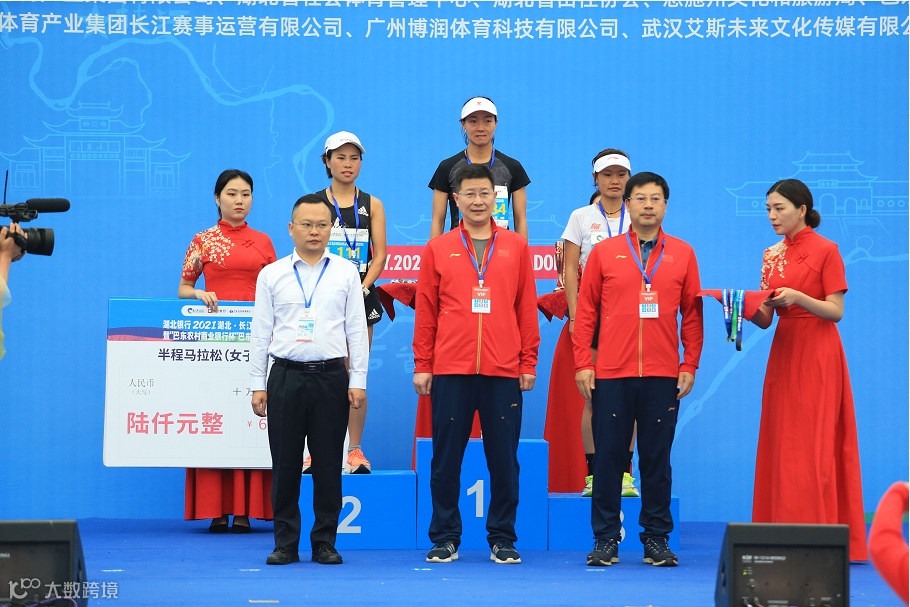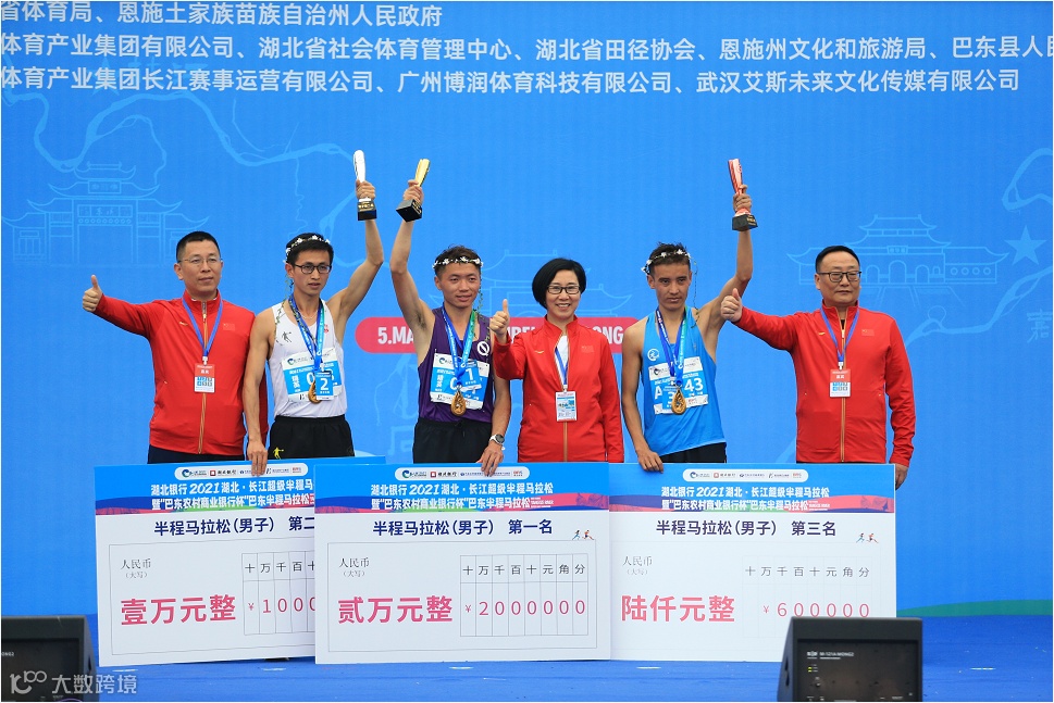 在这场21.0975公里的跋涉中,人们只有一个共同的身份:跑者。无论男女老少,无论成绩快慢,当你站在赛场上的那一刻起,你就是自己的英雄。贵州选手岑万江用时1小时06分27秒荣获半程男子组冠军、贵州选手王敏用时1小时15分42秒荣获半程女子组冠军。在湖北银行2021湖北·长江超级半程马拉松巴东站颁奖台上,颁奖嘉宾分别为半程马拉松男女组前三名颁奖。