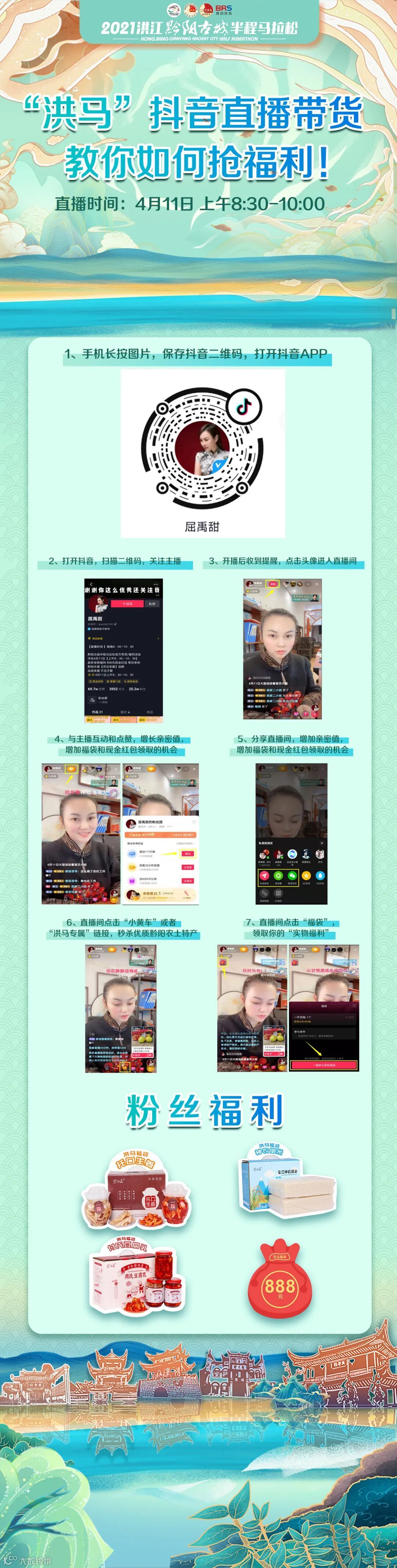 2021洪江黔阳古城半程马拉松首创抖音直播带货,借助“KOL+短视频”的快速传播性质让更多人见证赛事盛况,同时为洪江特产、旅游资源、湘西文化进行推广宣传,将洪江特色带到全国。真正做到“体育搭台,经济唱戏”的赛事发展原则。