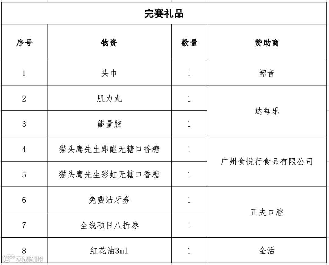 报名线上赛『套餐二』或『套餐三』的参赛选手,获得完赛包礼品一份。