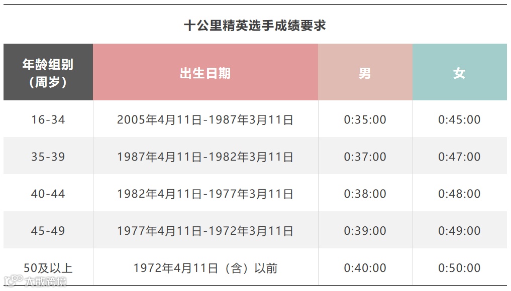 半程及十公里项目比赛日申请精英选手出发通道的已报名的参赛选手,半马及十公里PB(即个人最好成绩,可在中国田协官网查询成绩)达到以下水平的参赛选手,均可发邮件至组委会申请精英选手出发通道;