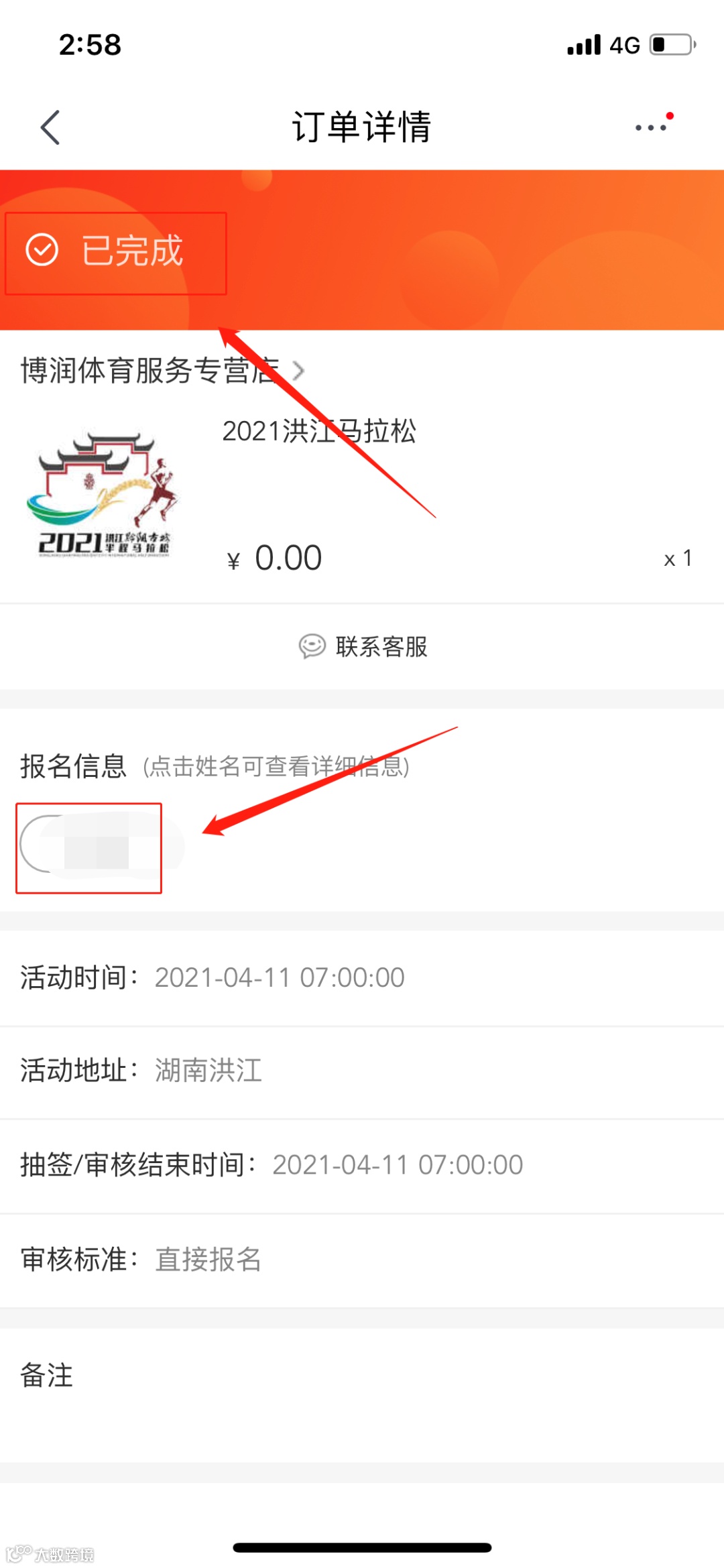 第四步:详情显示“已完成”,报名信息显示“选手姓名”,即为报名成功