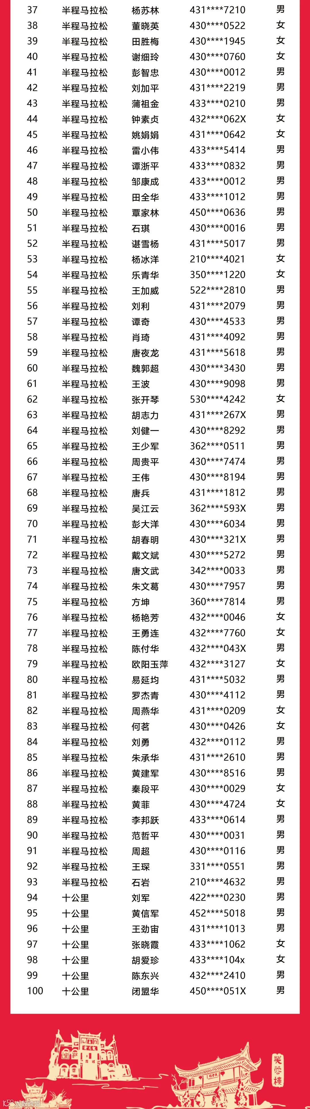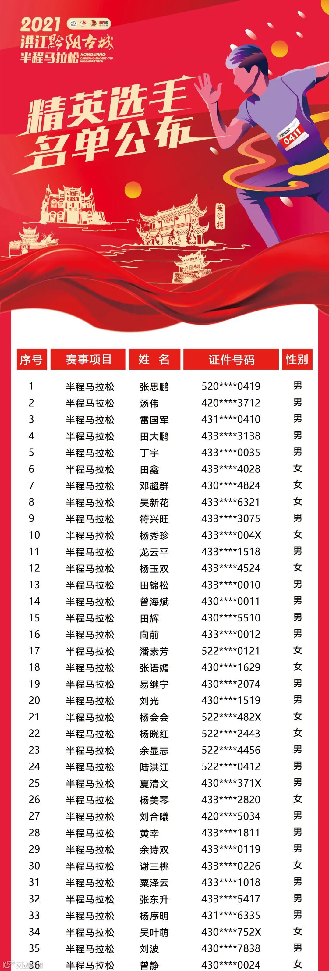 洪马精英选手申请通道于3月19日开启,截止至3月22日,组委会收到大量的申请邮件,经过严格筛选,共计有100位参赛运动员入选精英选手,具体名单如下: