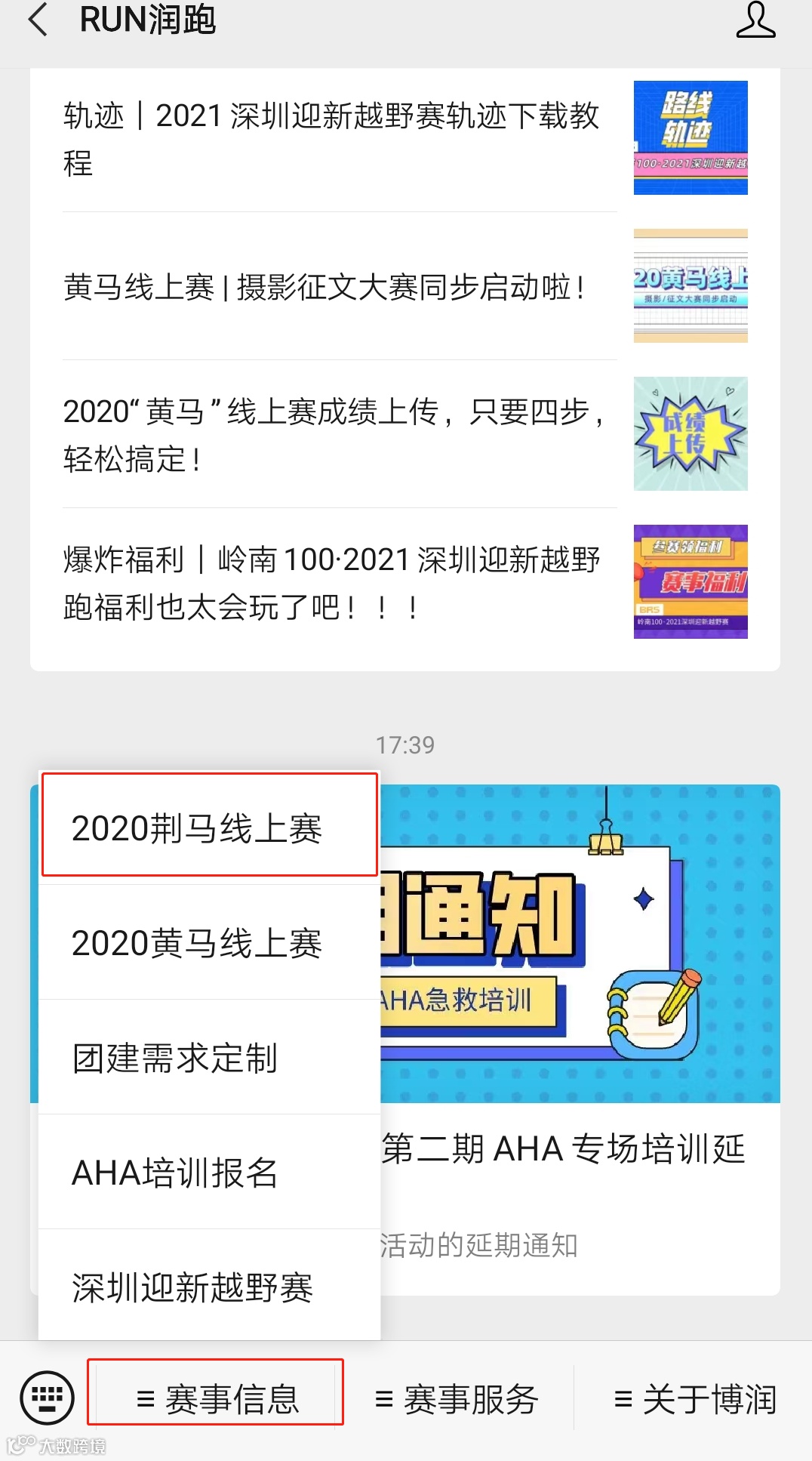 2.进入公众号对话框,在下方的菜单栏“赛事信息”中点击“2020荆马线上赛”进入报名链接
