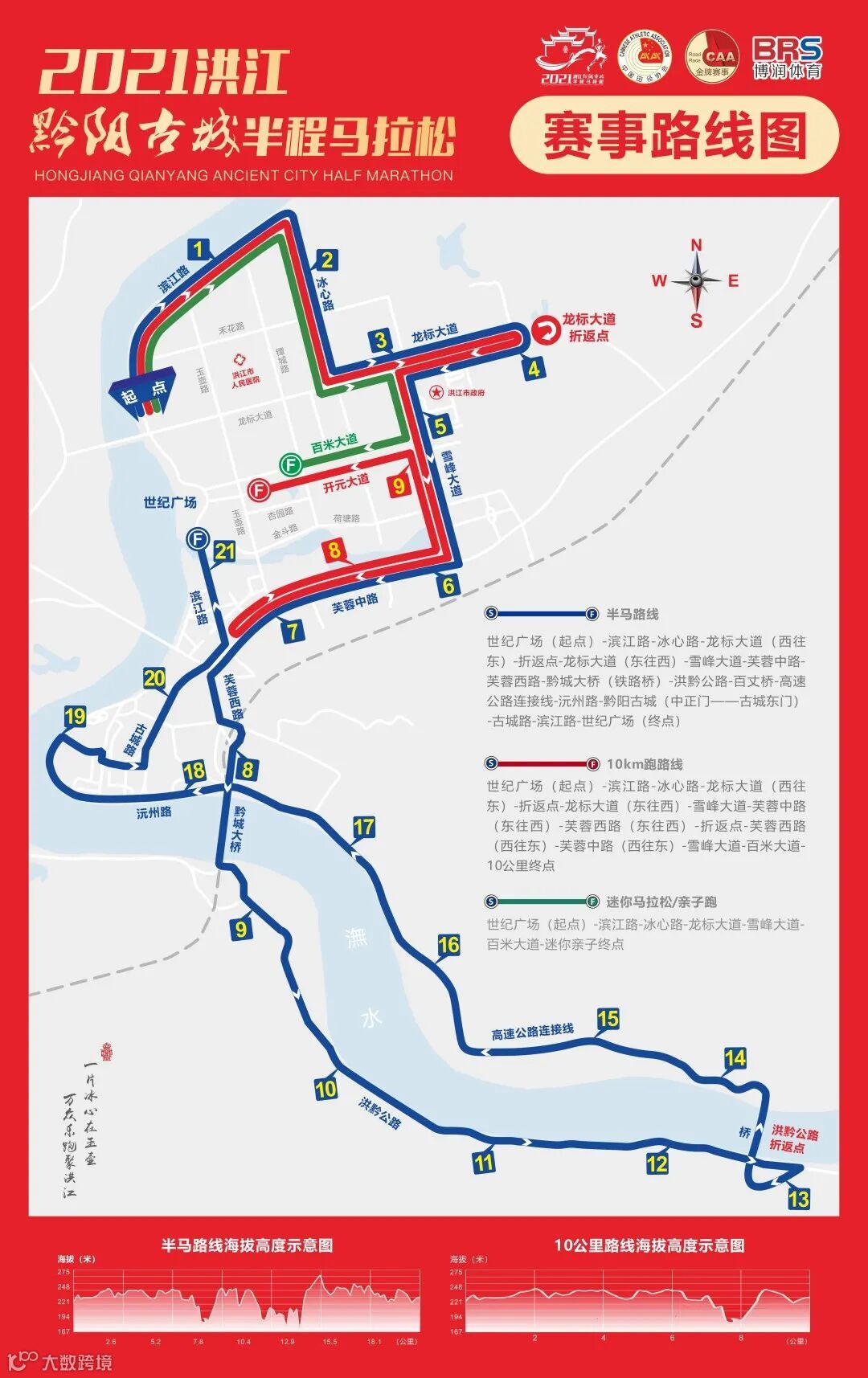 2021洪马基本沿用“一江两岸”的路线设置赛道,将半程马拉松部分赛道设置在洪江黔阳古城,参赛选手将穿过黔阳古城三大名楼之一的中正门,进入古城,踏过青砖,跑过深巷,在奔跑的同时,充分感受这座有着2200多年历史古城的人文与韵味。