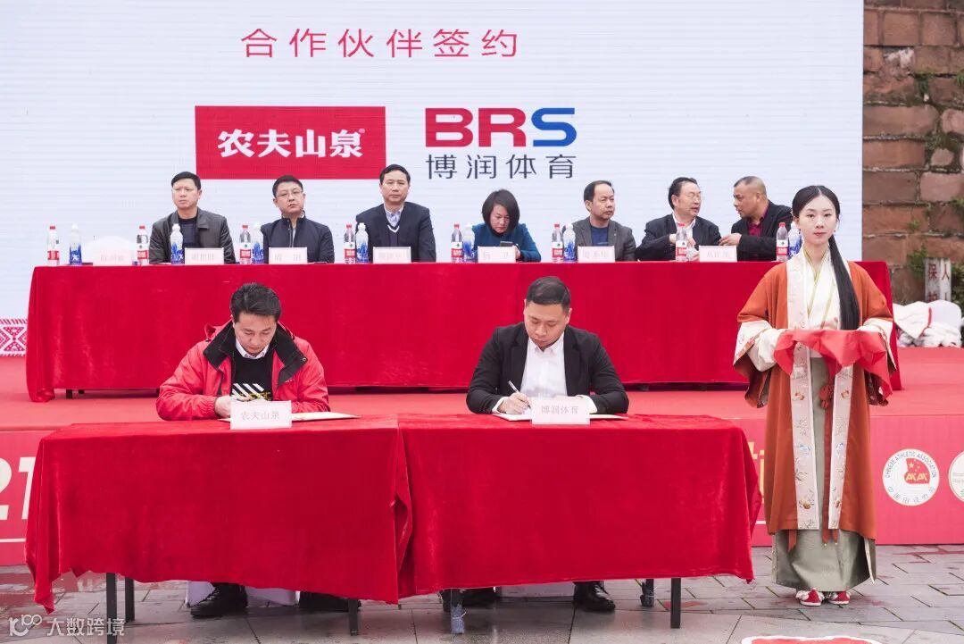 2021洪江黔阳古城半程马拉松得到了国内多个企业的赞助及服务支持。在发布会现场,举行了赞助商签约仪式,广州博润体育科技有限公司赛事运营部总经理陈剑钦分别与合作伙伴农夫山泉股份有限公司怀化办事处经理宋海波、合作伙伴湖南省文化体育旅游协会常务副会长、长沙市体育产业协会会长、深圳运动保湖南运营中心合伙人谢一鸣、合作伙伴湖南力达置业投资有限公司副总经理郭少林、赛事赞助商及指定用车怀化市吉程汽车贸易有限公司行政经理潘文武、赛事赞助商湖南捷超集团有限公司市场部总监肖茜、赛事赞助商洪江市晨风房地产开发有限公司办公室主任兼销售经理蒋才菊进行了现场签约。