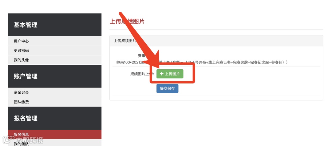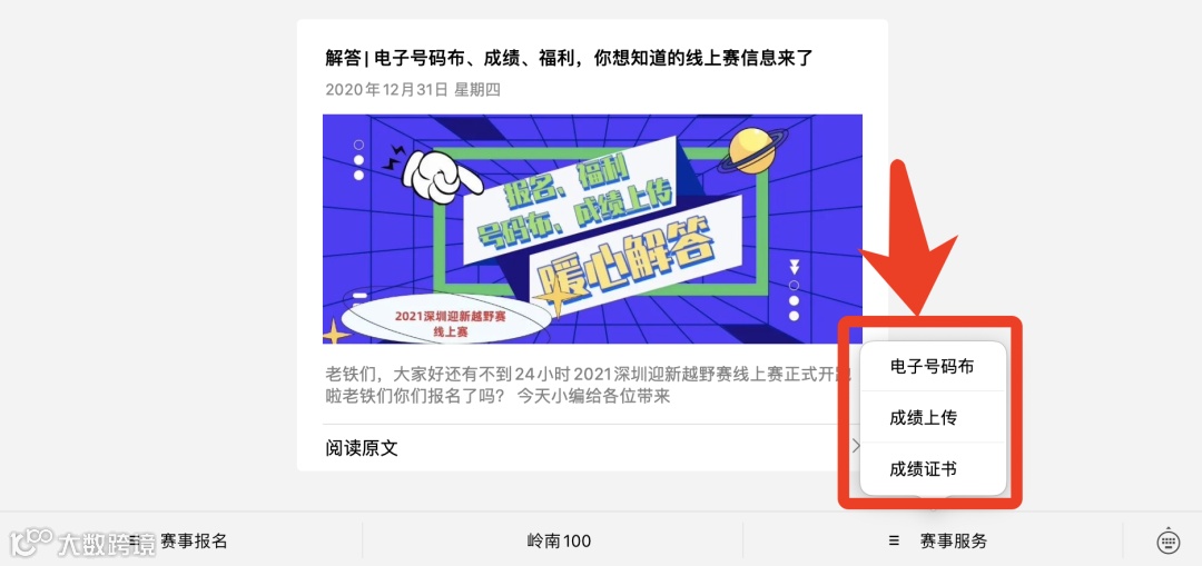 1、搜索“岭南100”公众号,点击下方菜单栏赛事服务,找到“成绩上传”。