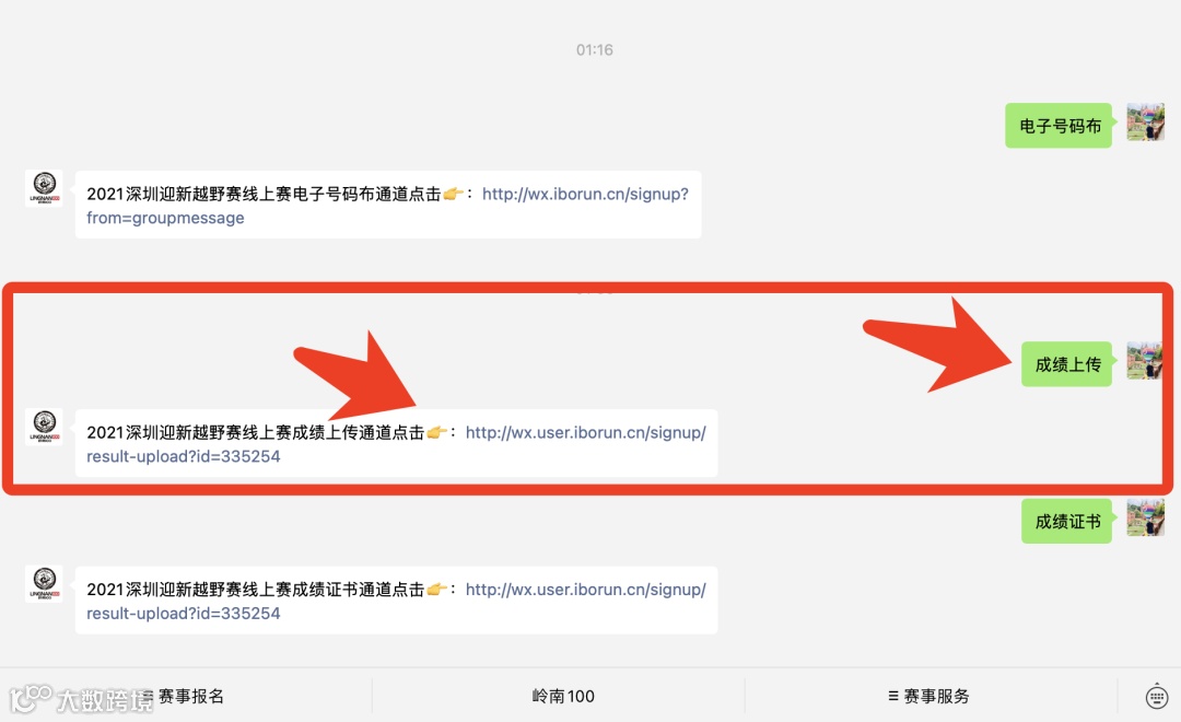 2、公众号回复“深圳迎新越野赛线上赛成绩上传”或“成绩上传”等关键词,点击成绩上传链接。