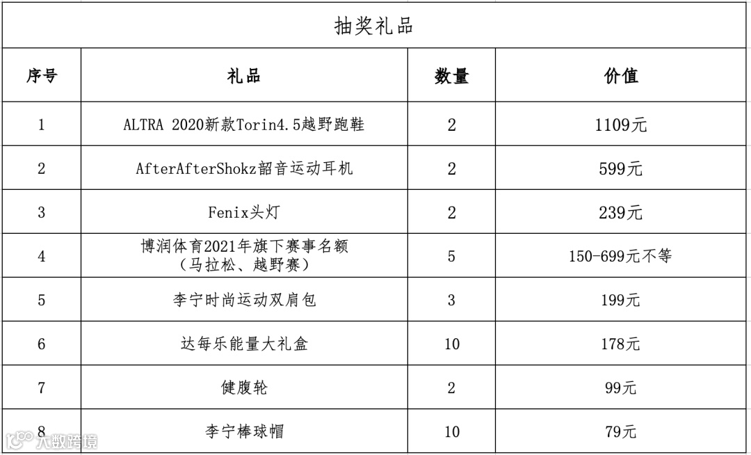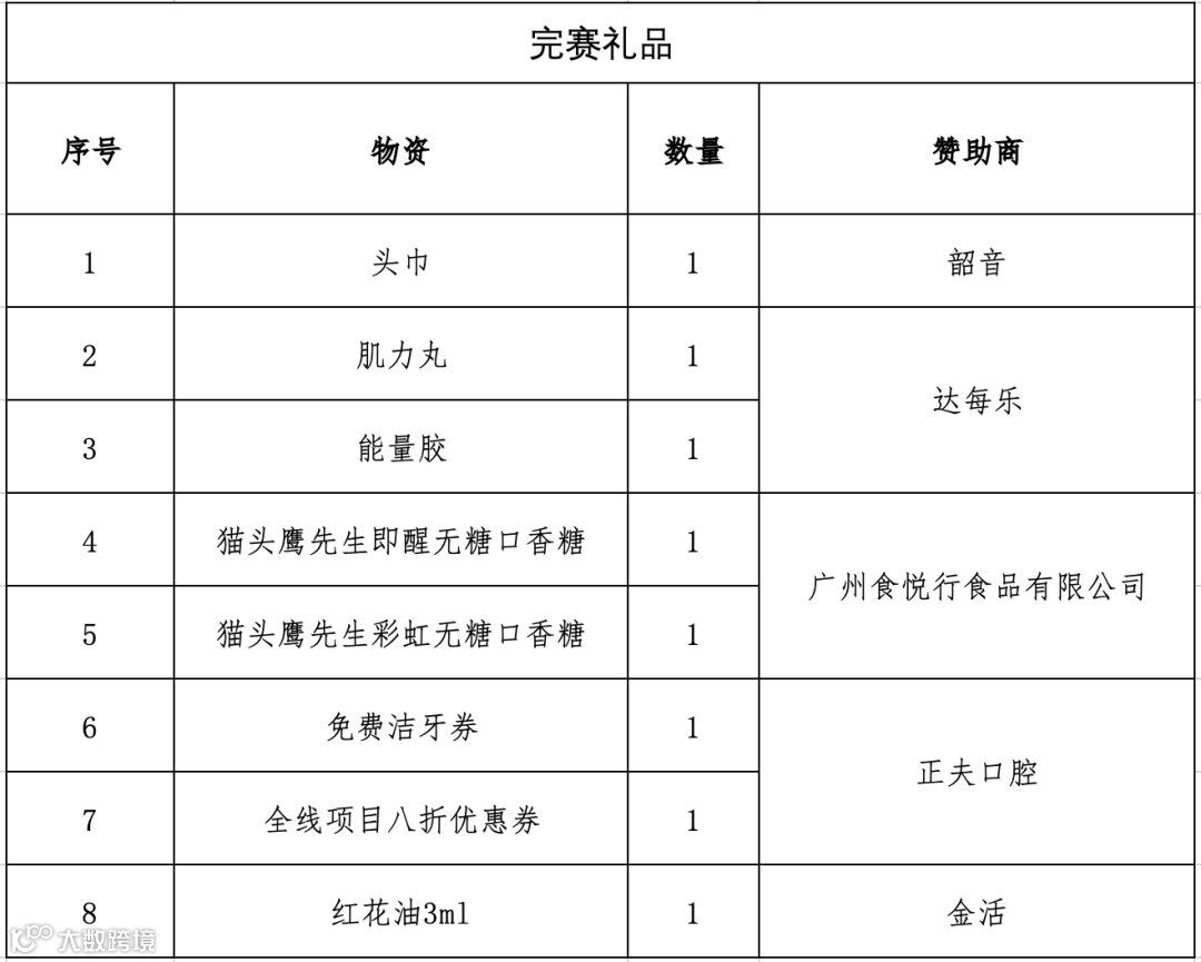 选择线上赛报名『套餐二』或『套餐三』的参赛选手,将获得完赛包礼品一份,同时有机会参加赛事线上抽奖活动,完赛包及抽奖礼品具体内容如下: