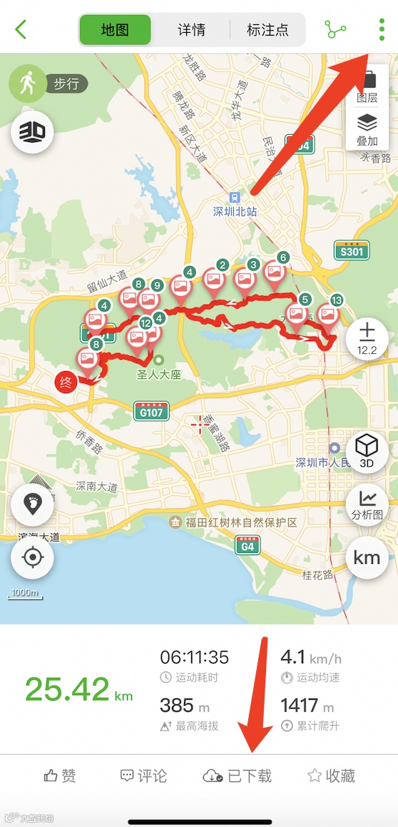 在“两步路”App上,搜索“岭南100-2021深圳迎新越野赛”字样,上传者为【空城】,点击下载即可。如图所示: