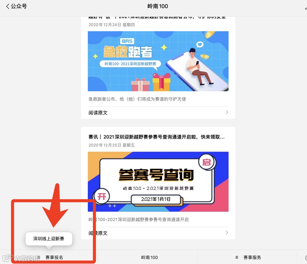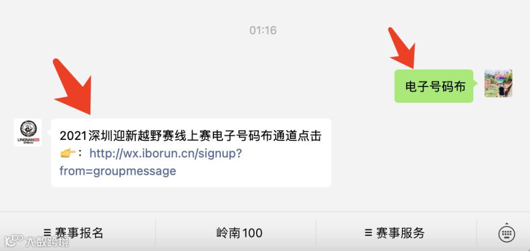 2、关注微信公众号 “岭南100”,在报名成功24小时后,可在后台发送“电子号码布”、“号码布”等关键词,获取链接进行查询!