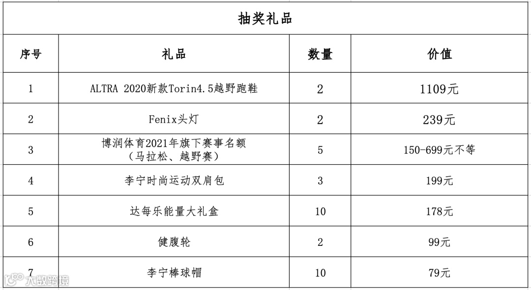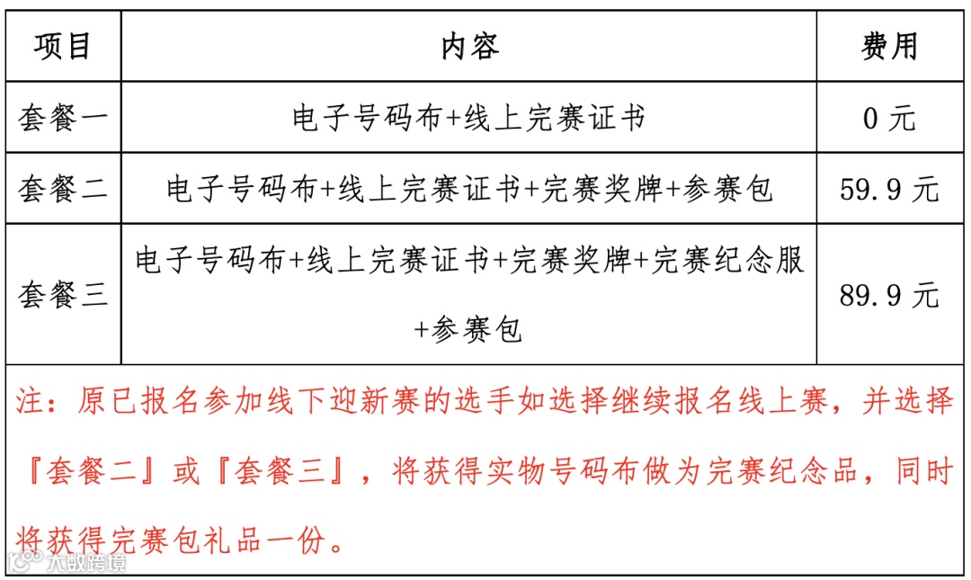 选择线上赛报名『套餐二』或『套餐三』的参赛选手,将获得完赛包礼品一份,同时有机会参加赛事线上抽奖活动,完赛包及抽奖礼品具体内容如下: