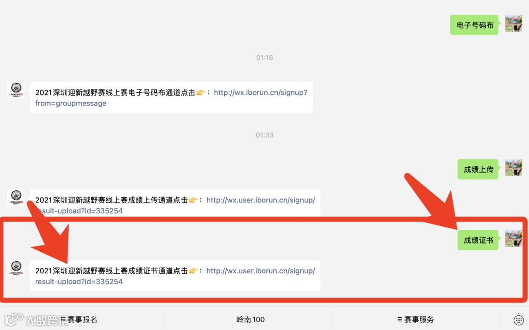 2、关注微信公众号 “岭南100”,完赛后可在后台发送“成绩上传”、“成绩”等关键词,获取链接进行下一步操作!
