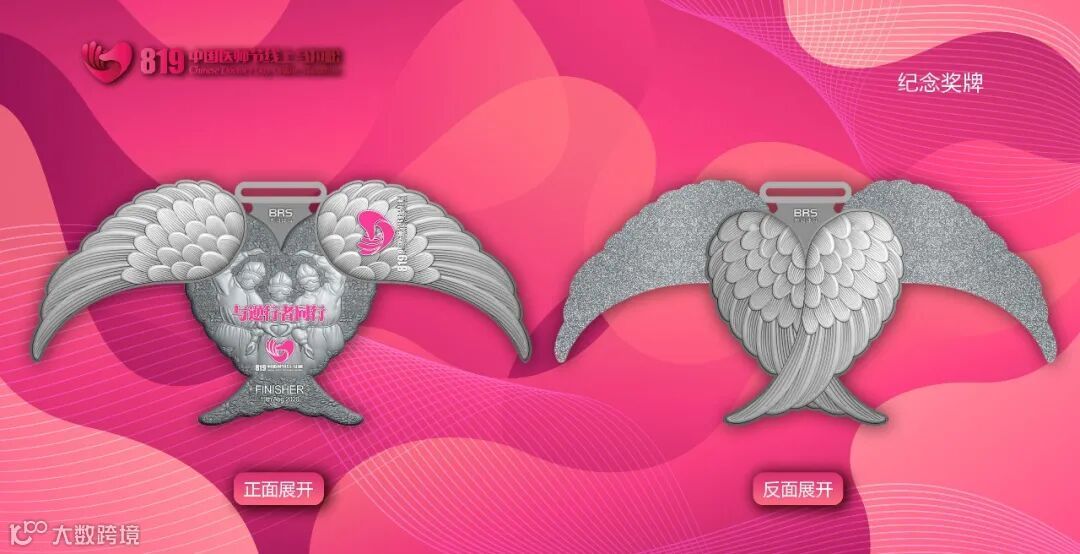 本次赛事的奖牌,由知名设计师李淳(其作品被世界六大马拉松组委会收藏)设计。奖牌设计非常精巧,翅膀可以活动,一张一合就像天使在起舞,非常具有趣味性。奖牌分为金色款、银色款和古铜款三种颜色,供大家选择,设计非常贴心。