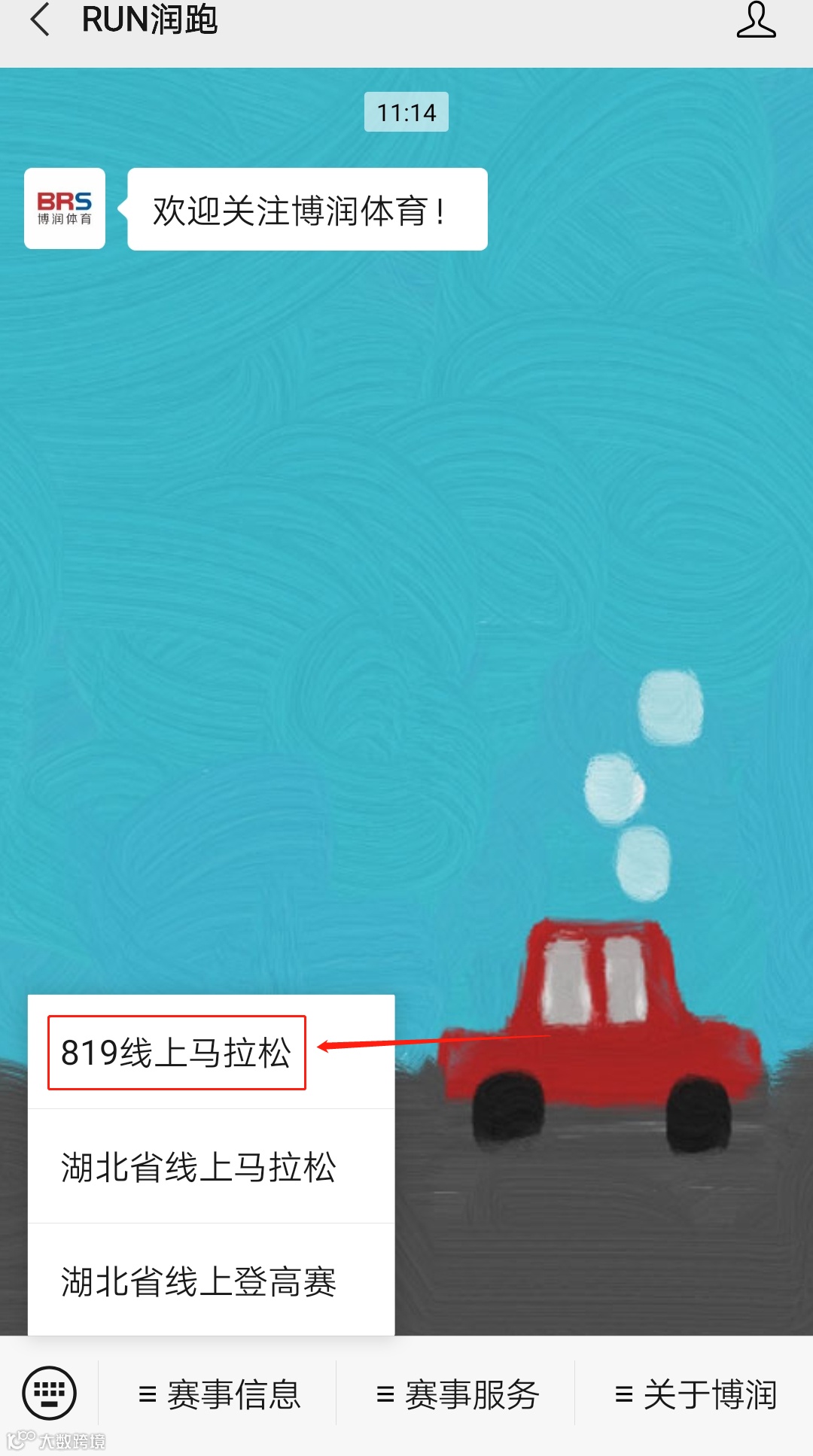 2.进入公众号对话框,点击左下角赛事信息,找到8·19线上马拉松。