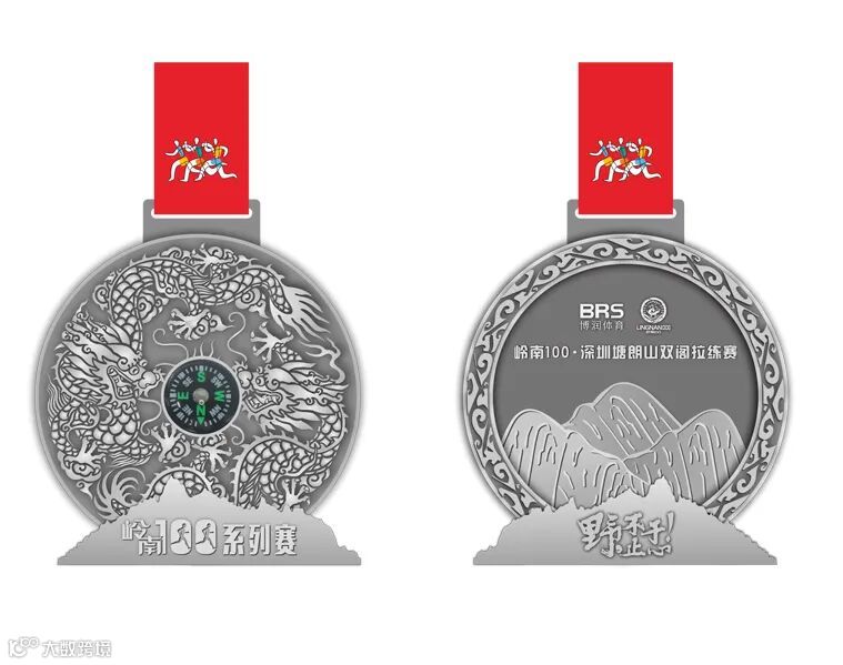 正面以塘朗山公园龙珠门为设计元素,以龙为设计主体,展现双龙戏珠的动态形象,寓意吉祥喜庆。中间的“珠”则用指南针表现,让奖牌多了更多的实用性。底部轮廓为本次塘朗山拉练赛海拔线。